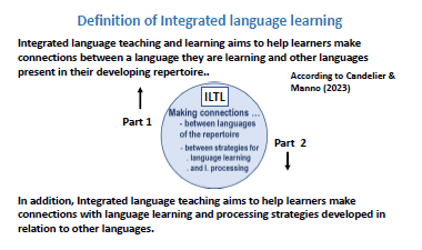 In La didactique intégrée des langues - Apprendre une langue avec d'autres langues (Candelier & Manno 2023, 27) an updated and expanded definition of IDAL can be found, which takes account of the general development of this approach over the previous ten years: “Integrated language teaching and learning [= the Integrated didactic approach to languages] aims to help learners make connections between a language they are learning and other languages present in their developing repertoire. In addition, Integrated language teaching aims to help learners make connections with language learning and processing strategies developed in relation to other languages.” In this definition, the languages on which learning is based extend beyond those taught in school: they are those in the learner's repertoire. In addition to transfers from one language to another, this definition also includes transfers of strategies that have been built up during previous language learning. Diagram.