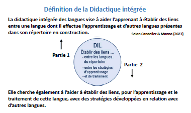 On trouvera dans La didactique intégrée des langues – Apprendre une langue avec d’autres langues (Candelier & Manno 2023, 27) une définition renouvelée et élargie de la DIL, qui prend en compte l’évolution générale de cette approche au cours des dix années précédentes : « La didactique intégrée des langues vise à aider l’apprenant·e à établir des liens entre une langue dont il ou elle effectue l’apprentissage et d’autres langues présentes dans son répertoire en construction. Elle cherche également à l’aider à établir des liens, pour l’apprentissage et le traitement de cette langue, avec des stratégies développées en relation avec d’autres langues. ». Dans cette définition, les langues sur lesquelles on s’appuie ne sont plus limitées à des langues qu’on apprend à l’école : il s’agit de celles du répertoire de l’apprenant·e, y compris celles qu’il/elle est en train d’apprendre. Outre les transferts de langue à langue, cette définition prévoit également des transferts de stratégies qui ont été construites lors d’apprentissages linguistiques antérieurs. Schéma.